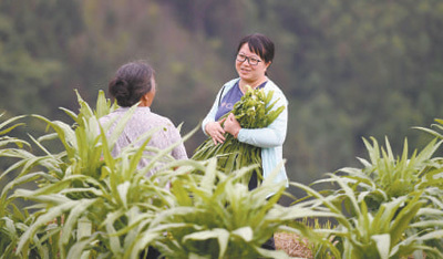 图为杨宁(右)帮助村民干农活。融水苗族自治县委宣传部供图