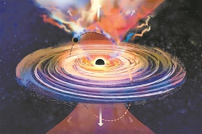 该巨型黑洞的“体重”为5000万倍太阳质量,位于距地球8亿光年的星系中心。研究显示,该黑洞每8.5天喷射出一大块气体,然后再次安静下来,“打嗝”原因在于一颗较小黑洞在其倾斜轨道上飞来飞去,就像是大黑洞的“舞伴”,定期将气体从吸积盘中“踢出”。