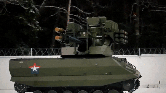 视频显示,无人战车由履带驱动,装有榴弹发射器和机枪。遭到无人机攻击时,2辆战车没有任何动作,可能已经处于毁坏或失联的状态。