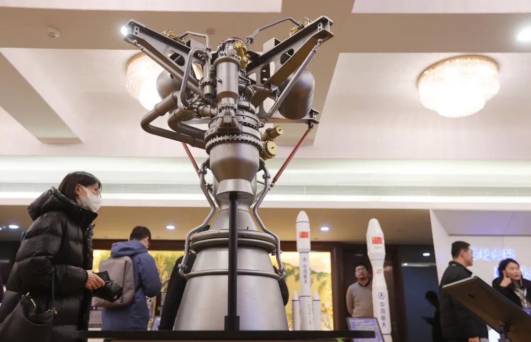 △2024年2月3日,北京商业航天产业高质量发展大会在亦庄举办,与会者在参观火箭发动机。