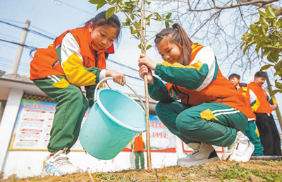 开展全民义务植树是推进国土绿化、建设美丽中国的生动实践。近年来江苏省积极组织义务植树活动进校园,提升学生爱绿植绿护绿意识。图为海安市南莫镇中心小学学生在唐庄河岸边参与义务植树活动。