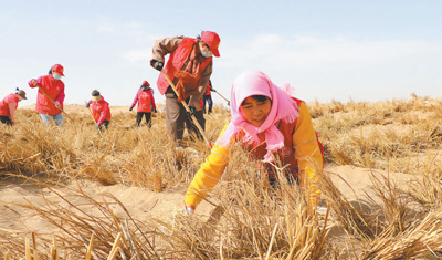 甘肃省通过跨区域综合治理等方式,全面推进“三北”工程攻坚战标志性战役。图为武威市民勤县上新村村民在进行压沙作业。