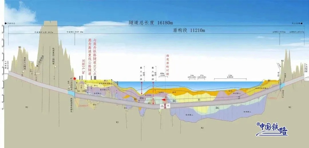 金塘海底隧道是甬舟铁路全线控制性工程,连通宁波、舟山两市,全长16.18公里,其中海底盾构段长11.21公里,最大埋深78米,最大水深39米。