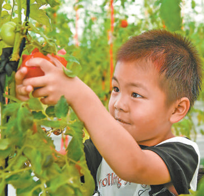 小朋友在浙江省宁波市海曙区古林镇茂新村采摘太空西红柿。
