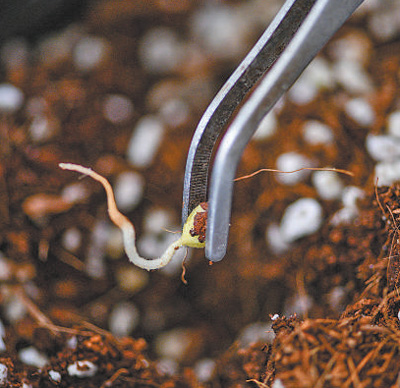 云南省锦科花卉工程研究中心里发芽的太空种子。