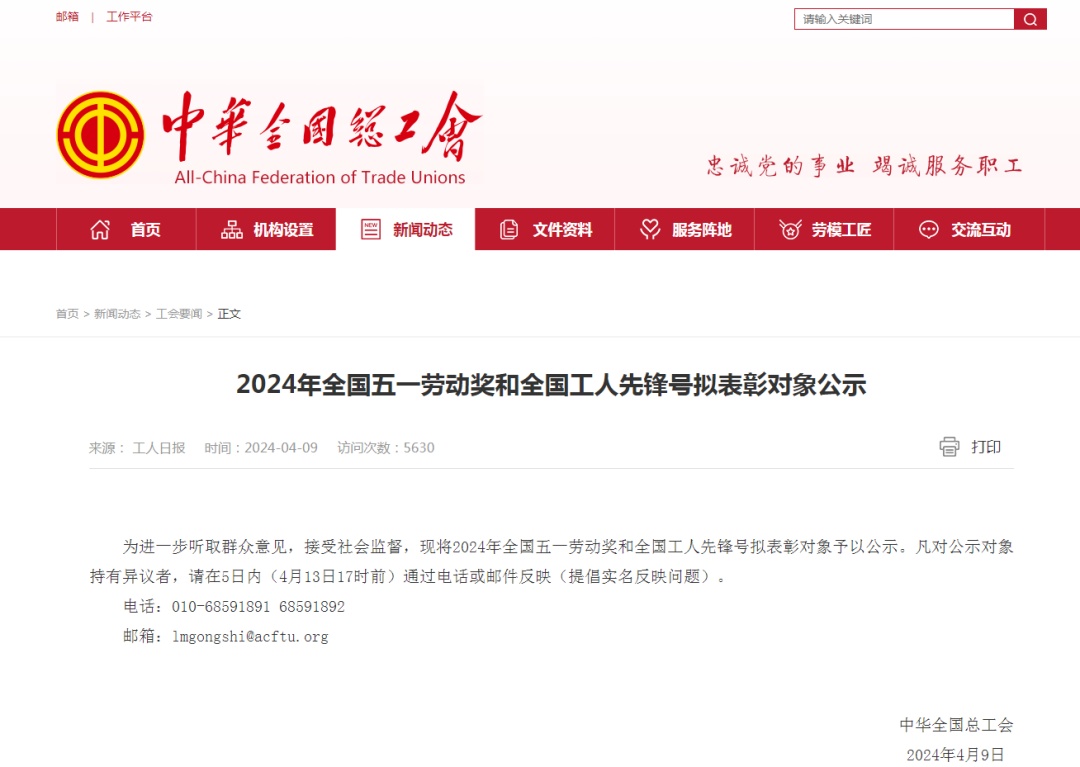 为进一步听取群众意见,接受社会监督,现将2024年全国五一劳动奖和全国工人先锋号拟表彰对象予以公示。凡对公示对象持有异议者,请在5日内(4月13日17时前)通过电话或邮件反映(提倡实名反映问题)。