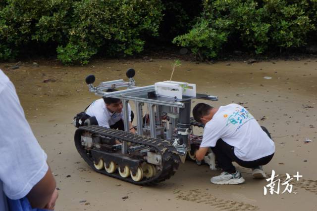 这是广东海洋大学湿地卫士实践团自主创新研发的新产品——红树林智能服务机器人种植红树林幼苗的场景。该设备由太阳能供电,可在红树林全自动自主耕种,减少90%人工成本。