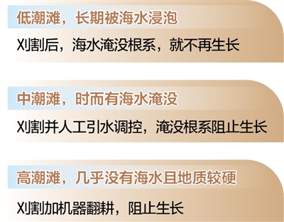 “在保护区内,圈出一块试验田,我们试过6种办法,物理技术、化学技术都用上了,最终结合黄河口地区实际,因地制宜确定了3种治理模式。”中国科学院烟台海岸带研究所副研究员谢宝华说,“低潮滩地势低,互花米草长期被海水浸泡,因此只需采用刈割的方式,加上海水淹没其根系,阻断光合作用后,它就不会再生长了;中潮滩时而有海水淹没,时而又没有,我们采用刈割加围淹,人工引水调控,淹没互花米草根系;高潮滩地势高,几乎没有海水,但地质较硬,机器上得去,我们就采用刈割加翻耕的办法。”在前期试验基础上,2020年,东营市正式启动互花米草全域治理,自然保护区是主战场。