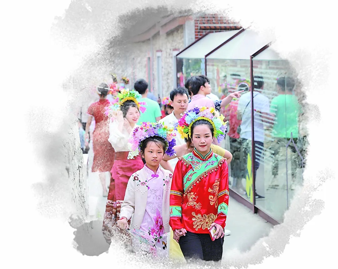 在梧林传统村落,200多幢承载乡愁的百年建筑散落其间,游客熙熙攘攘。放眼望去,传统簪花已成为泉州文旅新风尚。无论是在百年榕树下,还是古厝街巷里,随处可见头戴簪花的游客。