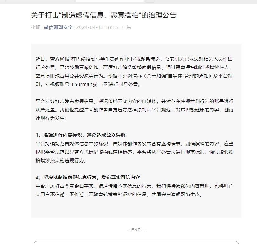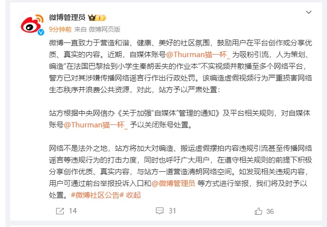 微博一直致力于营造和谐、健康、美好的社区氛围,鼓励用户在平台创作或分享优质、真实的内容。近期,自媒体账号@Thurman猫一杯_ 为吸粉引流,人为策划、编造“在法国巴黎拾到小学生秦朗丢失的作业本”不实视频并散播至多个网络平台,警方已对其涉嫌传播网络谣言行作出行政处罚。该编造虚假视频行为严重损害网络生态秩序并浪费公共资源,对此,站方予以严肃处置: