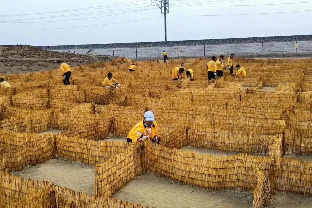 在沙漠种树需要科学有效的方法。芦苇沙障、芦苇方格和耐旱植物被称为防沙“三件套”。