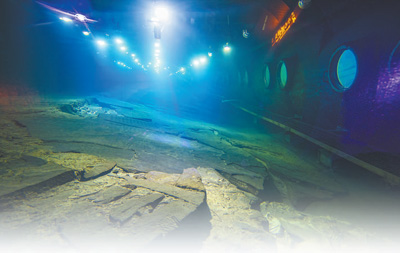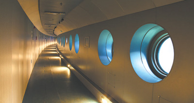 金属壳体内,再沿白鹤梁体建一条参观廊道,水下参观走廊宛如潜水艇,深潜江底,两端长廊与地面相通,游客可沿着参观廊道近距离观看白鹤梁上的题刻。