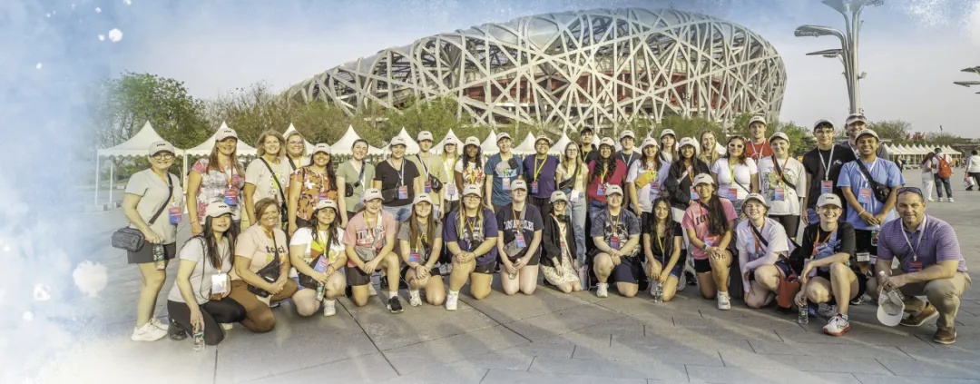 在北京国家体育场外,马斯卡廷中学师生合影留念。
