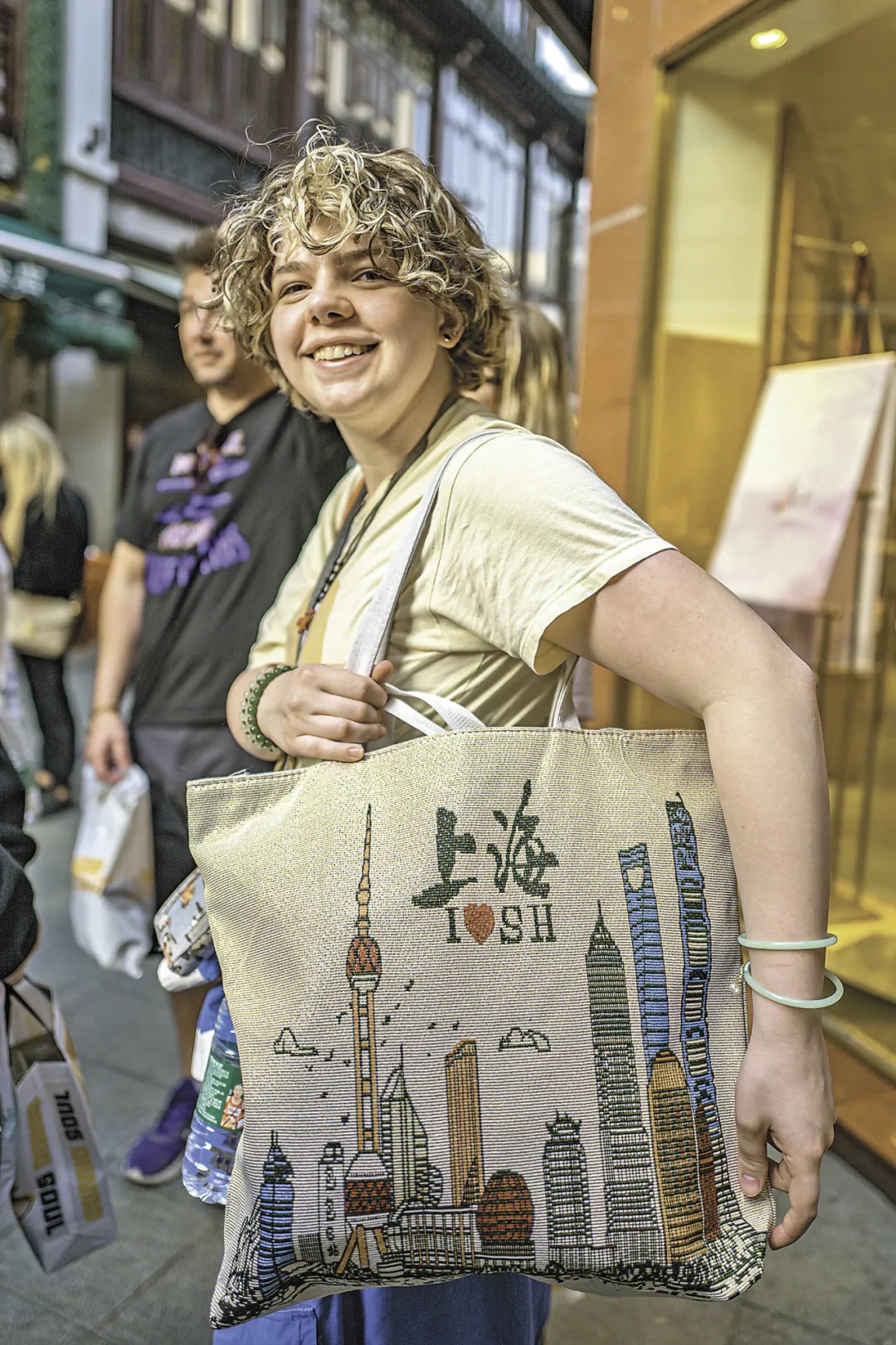 在上海豫园商城内,马斯卡廷中学学生展示选购的商品。王初 摄