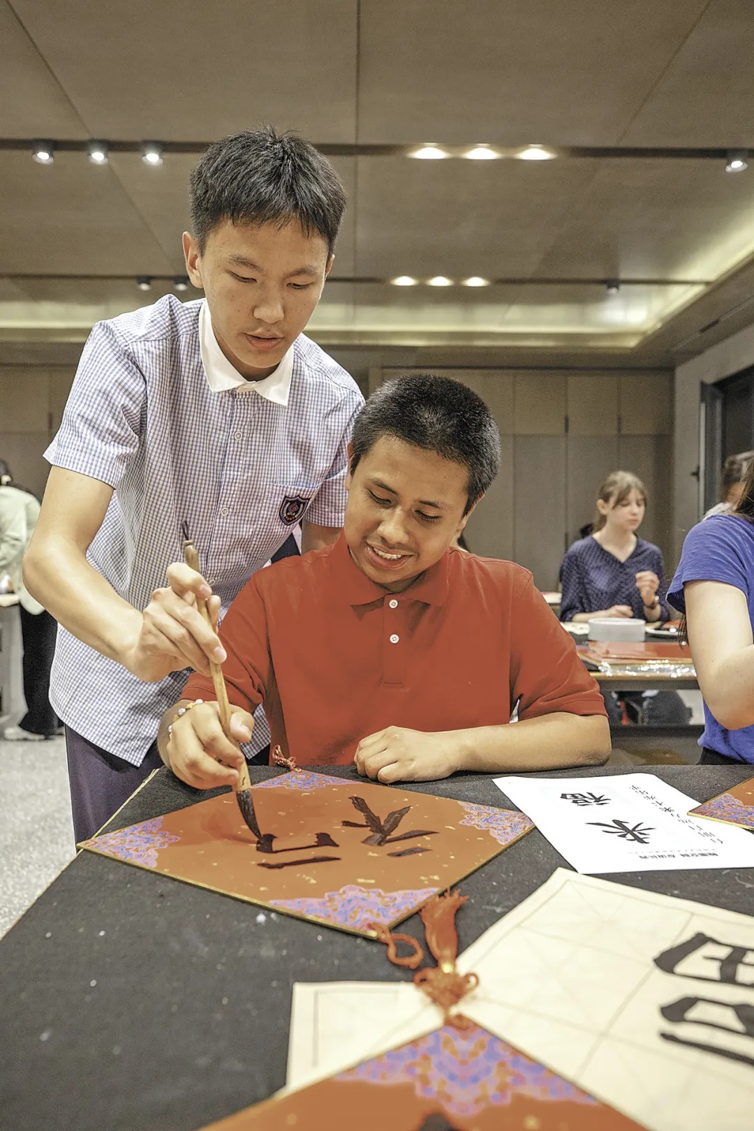 马斯卡廷中学学生(前)在体验汉字书法。