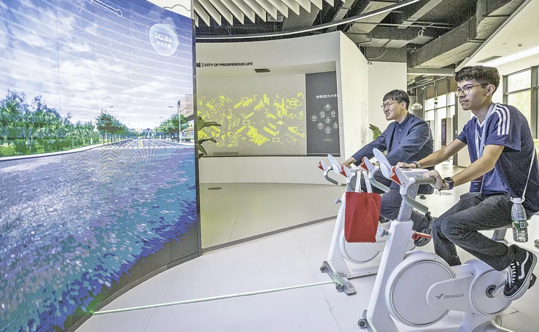 马斯卡廷中学学生(右)体验VR单车雄安新区城市漫游项目。