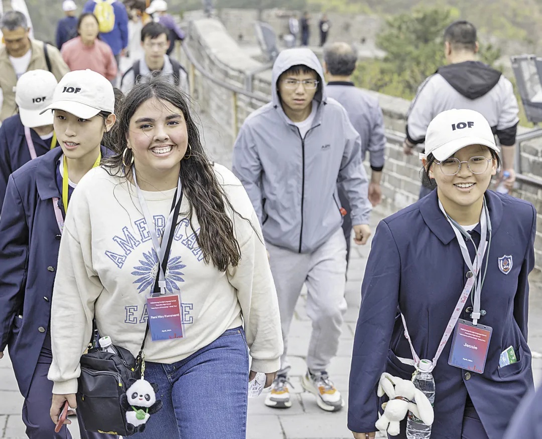 马斯卡廷中学学生(前左)登上北京八达岭长城。