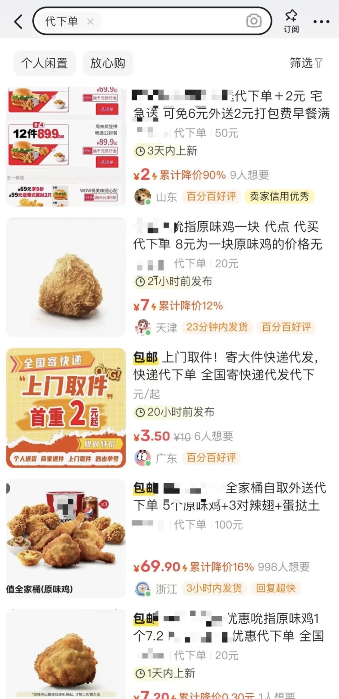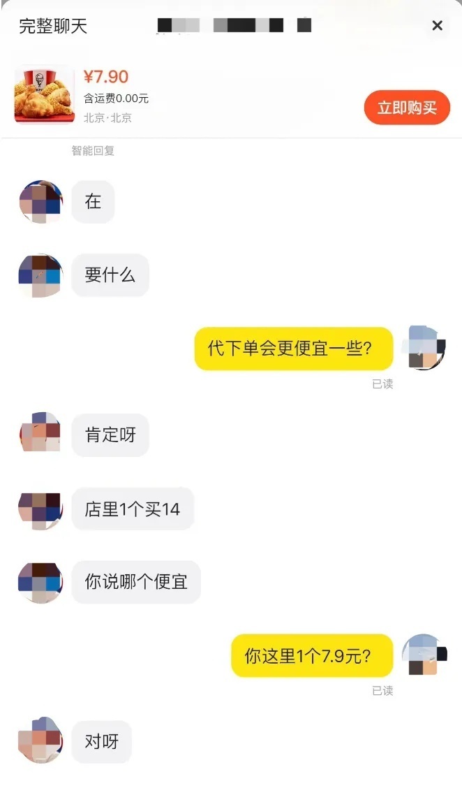 以某知名快餐品牌的原味鸡块为例,店内售价是每份14元,“代下单”仅需7.9元。卖家说,只需提供所在城市的对应门店名称,在平台拍下“代下单”购物链接,由卖家在对应品牌快餐官方平台下单后,发取餐码给消费者去取餐即可。