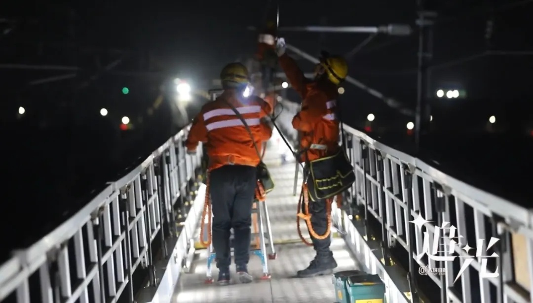 铁路维修工寻着手电筒的光亮