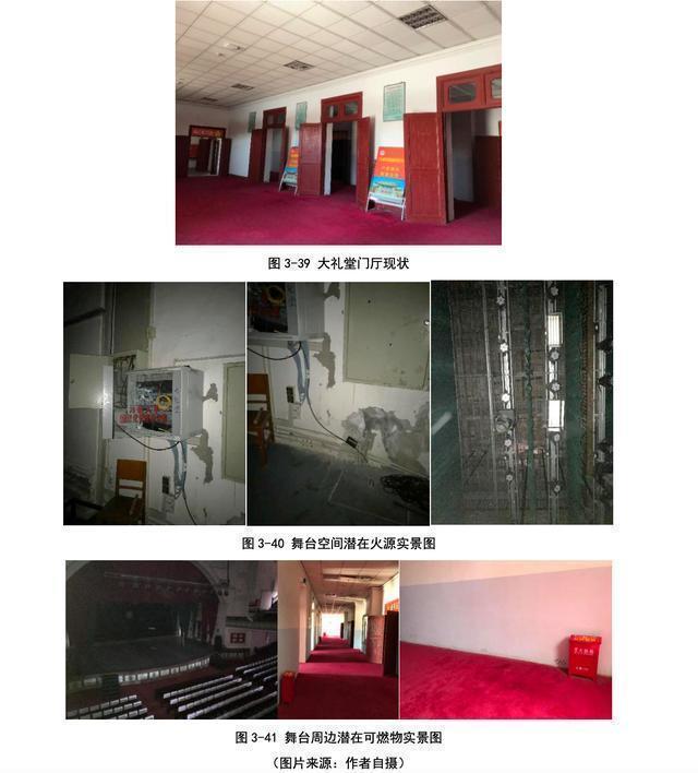 该论文指出大礼堂存在以下一些安全隐患:大礼堂北侧两个楼梯正对建筑的其中两个出入口,楼梯间无前室,与一段走道形成封闭楼梯间,靠外墙处开设窗洞,提供自然通风和采光。封闭楼梯间内的门均为双开木门,防烟防火性能较弱,人员疏散时易受烟气侵袭。