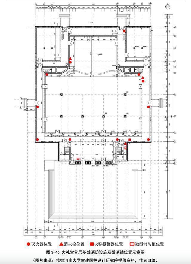 大礼堂首层基础消防设施及微消站位置示意图。论文截图