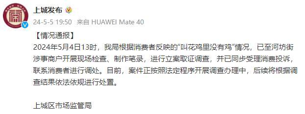 5月5日晚间7时50分,@上城发布 发布情况通报称,根据消费者反映的“叫花鸡里没有鸡”情况,上城区市场监管局已于5月4日13时至河坊街涉事商户开展现场检查、制作笔录,进行立案取证调查,并已同步受理消费投诉,联系消费者进行调处。目前,案件正按照法定程序开展调查办理中,后续将根据调查结果依法依规进行处置。