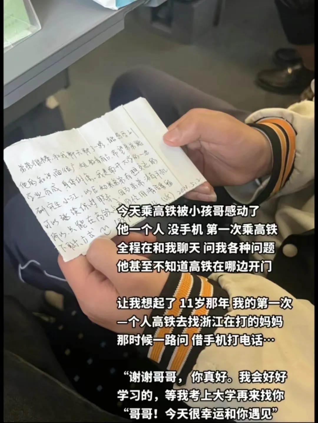你还记得自己第一次独立出行的经历吗?近日,大学生小江在社交媒体上发布视频,记录了自己和一位小男孩在高铁上相遇的故事。