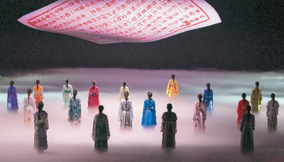 跟随游客的人流,步入“有还无”剧场,灯光渐灭,大剧上演。36扇高大的雕花木门轻启,“红楼36钗”信步走出,与曹雪芹进行穿越时空的对话。这些书中人在水深3厘米的舞台上表演,行进时激起清越的水浪声。舞台水面如同镜面,倒映出五光十色的“红楼梦世界”。舞台上时而随着音乐节拍落下层层水帘,时而化水成雾,氤氲缭绕,加上特殊的光影效果,美不胜收,引发观众的阵阵赞叹。