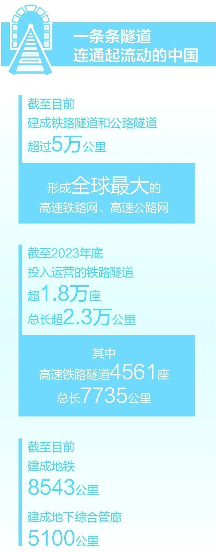 如今,中国建成铁路隧道和公路隧道超过5万公里,打通“咽喉要道”,形成了全球最大的高速铁路网、高速公路网。