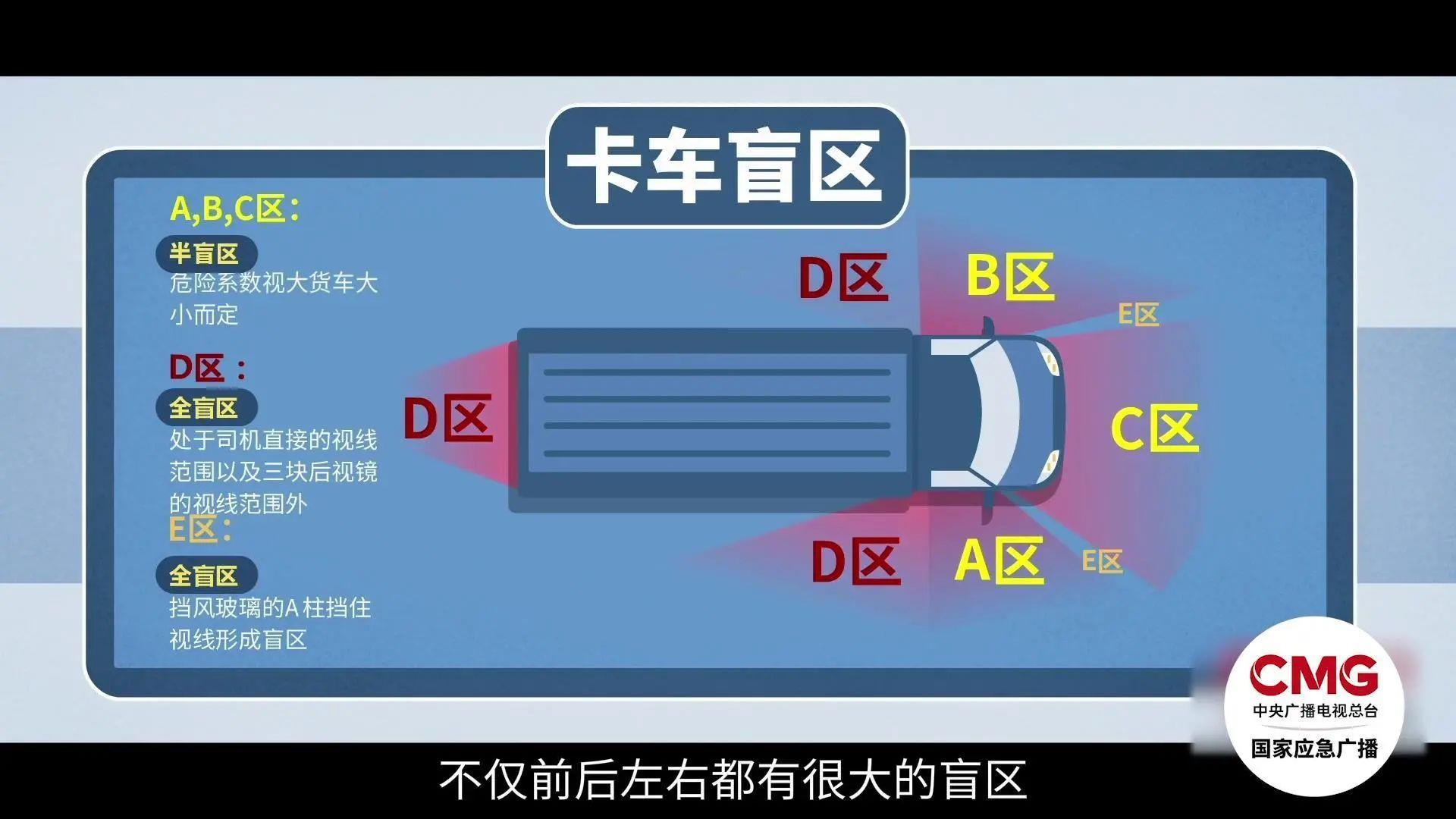 尽量避免停留在货车的盲区内,即下图所显示的红色区域。
