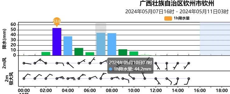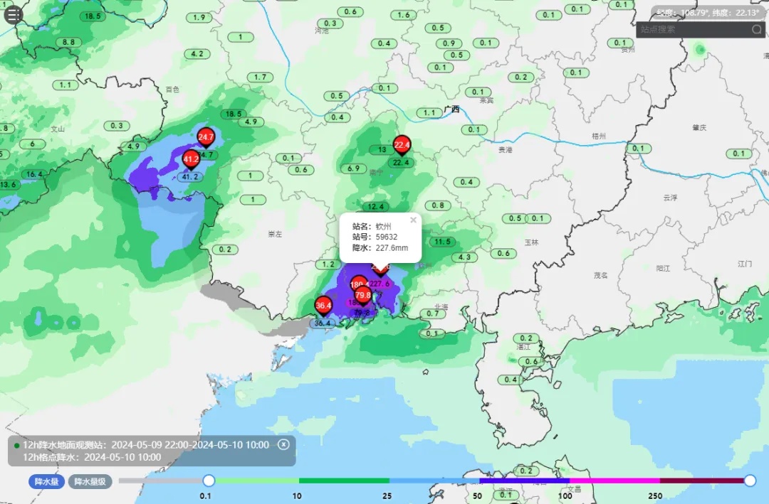 截至今天上午10时,钦州12小时累计雨量已达227.6毫米,达特大暴雨级别,即使按08-08的24小时累计雨量213.2毫米,也刷新了当地5月单日降雨纪录。