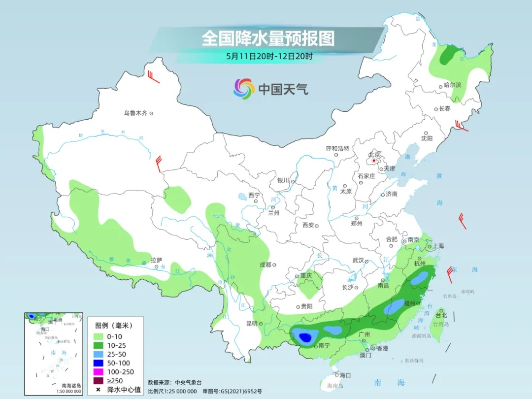 预计今天夜间到12日,西南地区东部、江南、华南等地部分地区有大雨或暴雨、局地大暴雨,累积降水量30-80毫米,局地100-150毫米。南方这轮降雨仍将以对流性降水为主,贵州、湖南、江西、湖北等地的部分地区会伴有短时强降水,最大小时降水量30-60毫米,局地超70毫米,注意防范强对流天气。