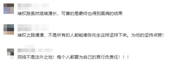 陈先生向记者表示,在他看来,相比赔偿,法院还了他一个公道才是最重要的事情。"希望这件事能让更多的人明白,网络不是法外之地,希望网暴者能有所收敛,也希望我的经历能够给维护自身合法权益的人勇气,这样我的付出就都值得了。"