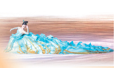 楚艳介绍,长裙整体造型采用了西式大礼服的廓形,上衣收腰、束身更便于展现演员的舞姿,而裙体中还点缀有3D复合工艺制作的亭台楼阁和树木纹样。“以中国传统文化为内核,以时代创新精神为风貌,传统美学融入当代时尚的方式,让艺术呈现有更宽广的可能性。”