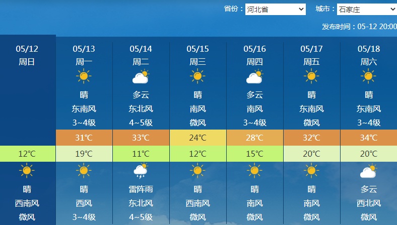 像石家庄,后天最高气温能达到33℃,到15日就会降至24℃。郑州后天最高气温将高达34℃,15日猛降至24℃。