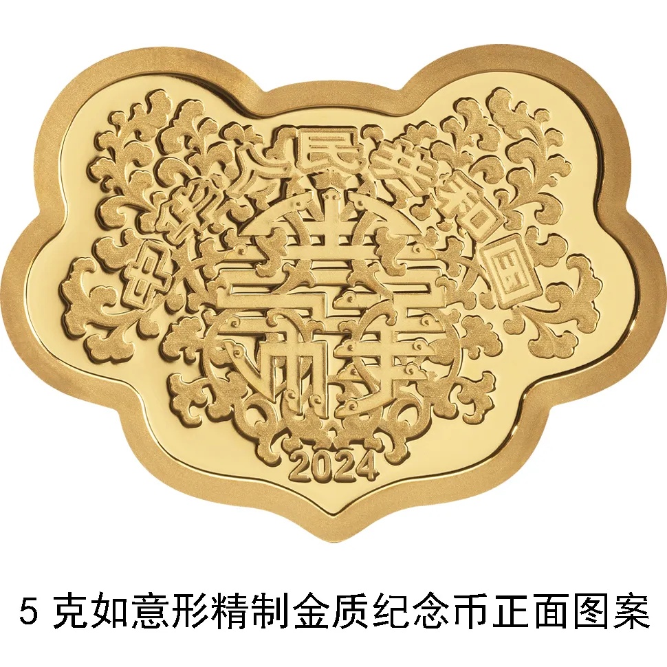 5克如意形金质纪念币为精制币,含纯金5克,外接矩形18毫米×24毫米,面额80元,成色99.9%,最大发行量10000枚。
