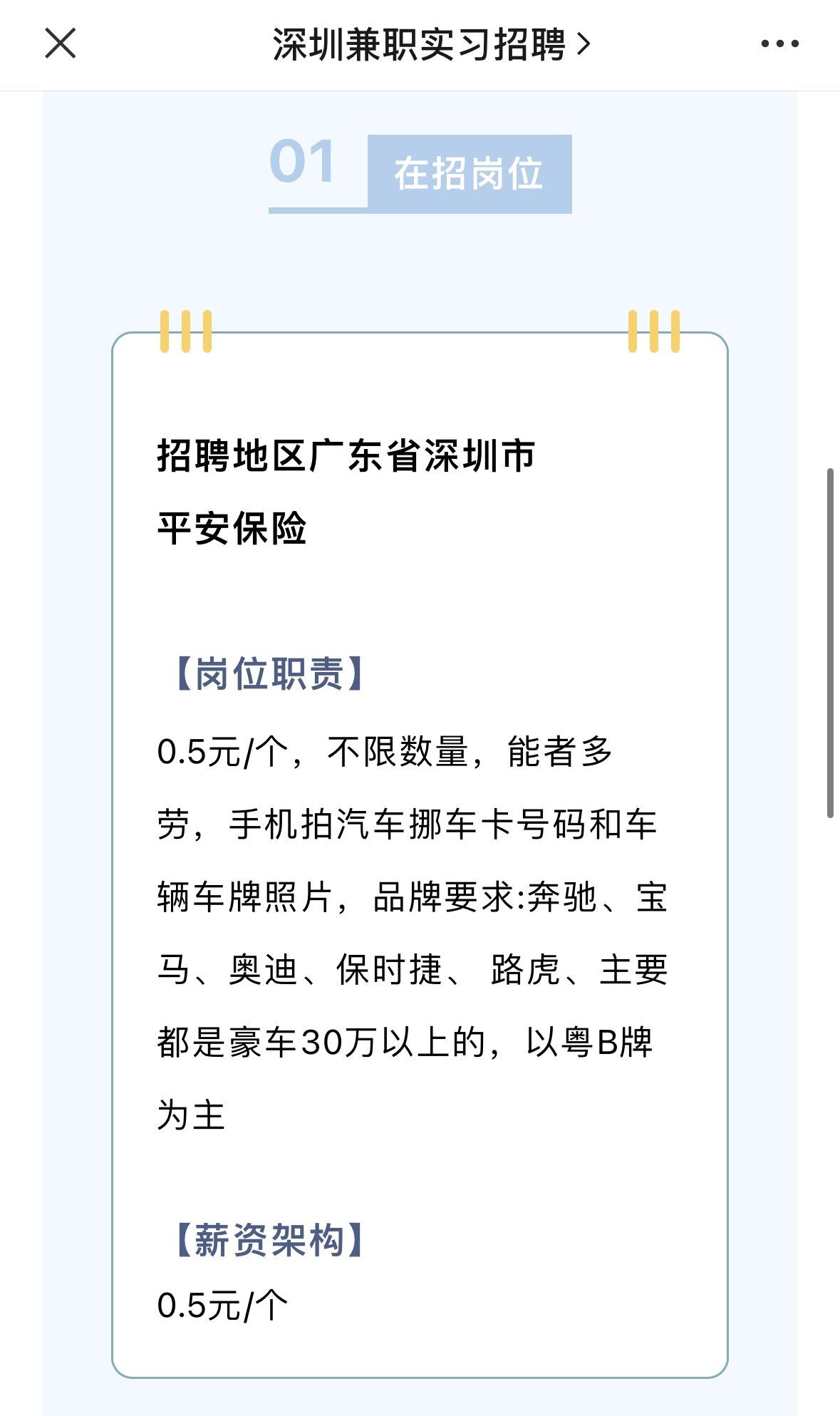记者根据线索在兼职平台搜索发现,该兼职信息于5月8日发布,工作内容为拍摄车头照,拍1个车头和一个挪车号码为一组,一组0.5元。同时对车辆品牌进行了限定,要求奔驰、宝马、保时捷、奥迪、雷克萨斯、路虎、沃尔沃、理想、蔚来,并注明必须是粤B或粤S牌照。