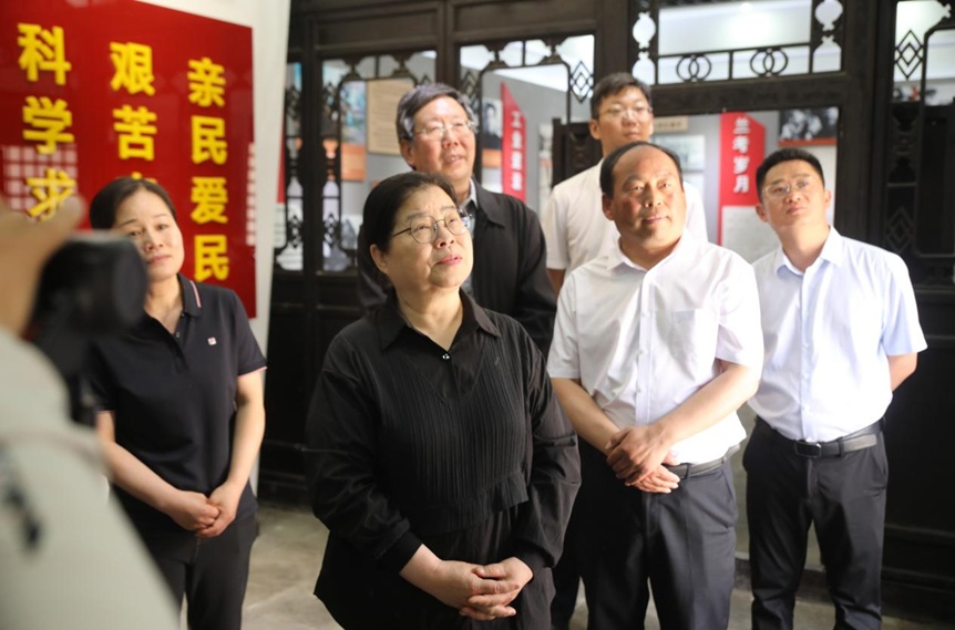 5月12日,焦裕禄的二女儿焦守云(左二)在尉氏县焦裕禄事迹纪念馆观看焦裕禄在尉氏工作时的事迹。李新义摄