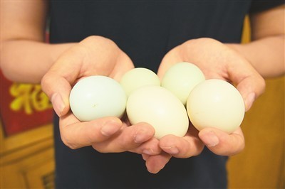 “你摸摸”,说着,卢大爷把鸡蛋递了过来。一摸,还热乎着!卢大爷边说,边把鸡蛋放进锅里煮。“这是刚下的绿皮鸡蛋,是五彩蛋鸡下的。”