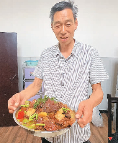 卢守峰展示烧制的新疆大盘鸡。 本报记者 赵 昊摄