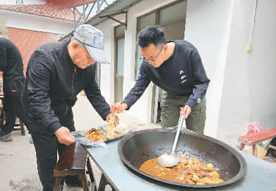赵昊(右)在刘皮村“孝善大食堂”为乡亲打饭。 健康时报记者 韩金序摄