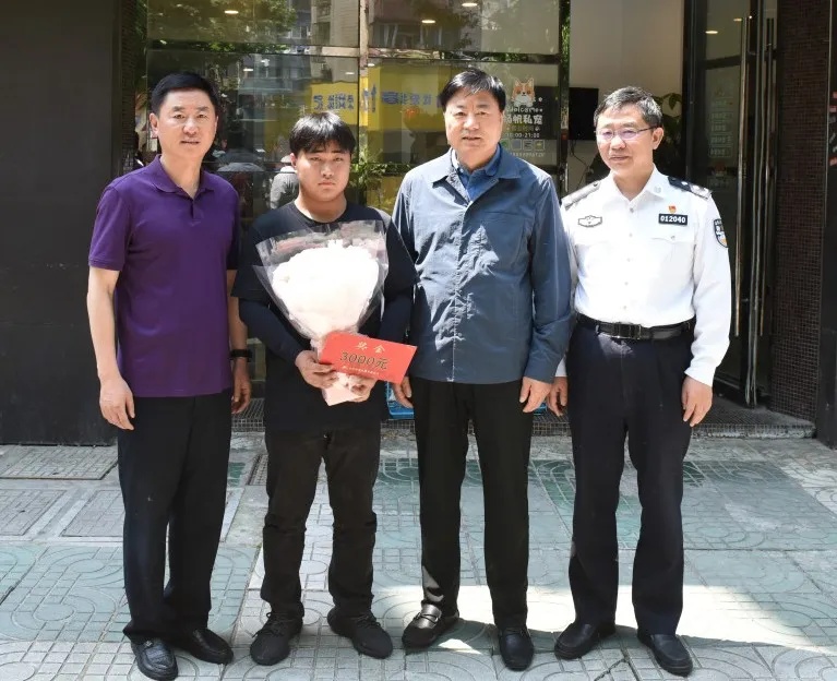 5月17日上午,市见义勇为基金会理事长孙建友一行专程前往杨帆的工作处所,为他颁发见义勇为专项奖励金并送上鲜花。