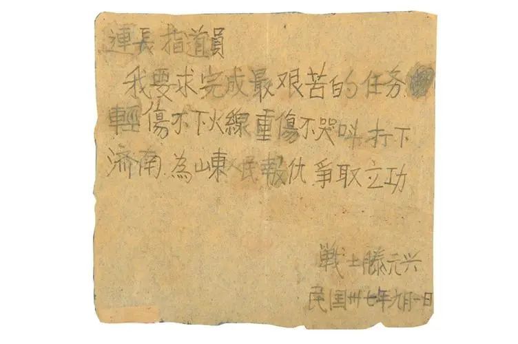 济南市博物馆有这样一件珍贵文物——济南战役中“滕元兴请战决心书”。纸张已经泛黄,还可以看出有血迹、泪水斑痕。上面以自来水笔书写56字,全文为:“连长、指导员:我要求完成最艰苦的任务,轻伤不下火线,重伤不哭呌(叫),打下济南,为山东人民报仇,取立功。战士滕元兴。民国卅七年(1948年)九月一日。”