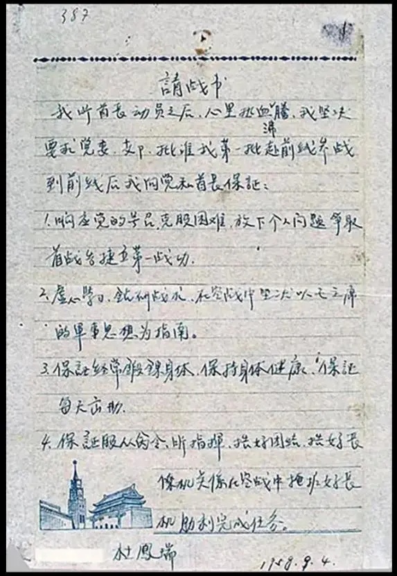 在中国人民革命军事博物馆里,收藏着这样一件宝贵的文物,是1958年9月4日,中国人民解放军空军“一等功臣”杜凤瑞亲笔写下的请战书。