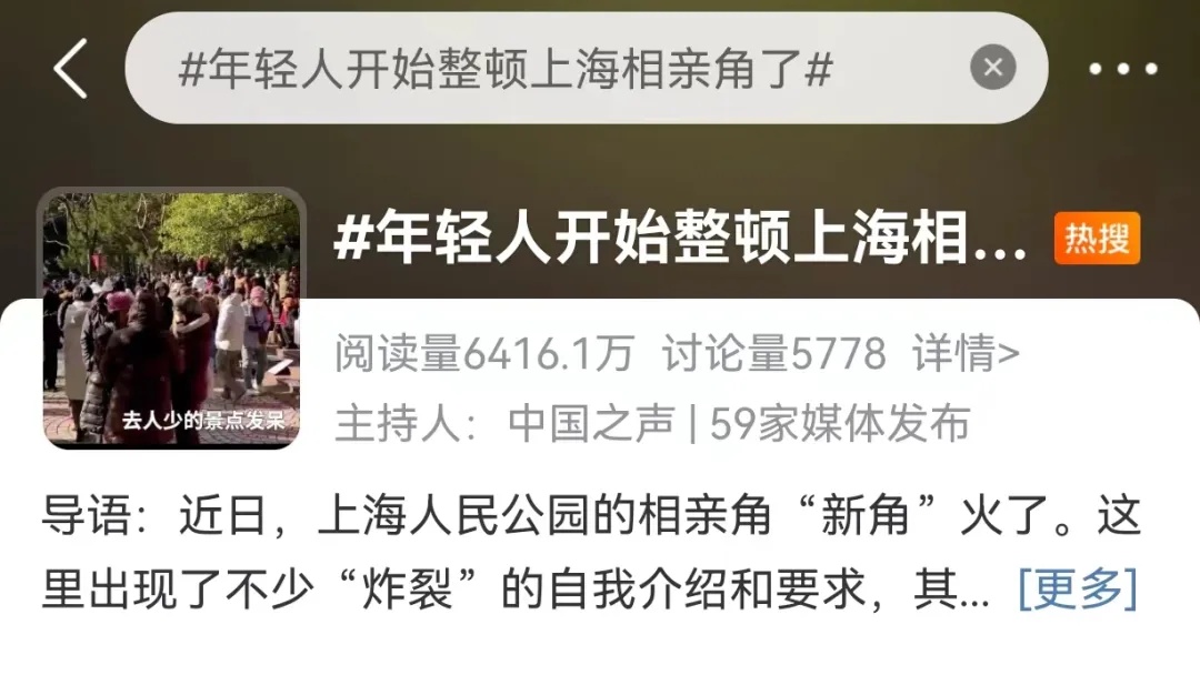 传统的公园相亲角,大多是由父母一辈主导和张罗的。然而,这种用一张A4纸写满各种“硬条件”,然后替子女寻求匹配对象的方式,却越来越不被年轻人买账。在一些视频平台上,不少年轻人都分享过自己“勇闯相亲角”的经历。他们时常发现,在这个场域里,自己往往处于被挑拣的境地,不是被嫌弃没户口,就是因为工作没编制被扣分。在这套高度同质化、被传统观念塑造的体系里,年轻人真正关心的生活方式、性格合拍、三观契合等面向,却往往被“忽略不计”。