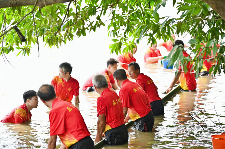 河中的老龙船埋船处,在十几位村中青壮年“扒丁”的合力抬动下,龙舟破水而出。趁着兴奋的劲头,“扒丁”们或清理船身上淤泥,或用水桶舀出船中积水。尽管浑身湿透,每位“扒丁”脸上都挂着喜悦的笑容。而后,祭祀完毕的龙头被安装到龙舟上,一套完整的“正丫起龙”仪式就顺利完成了,标志着东莞龙舟月正式到来。