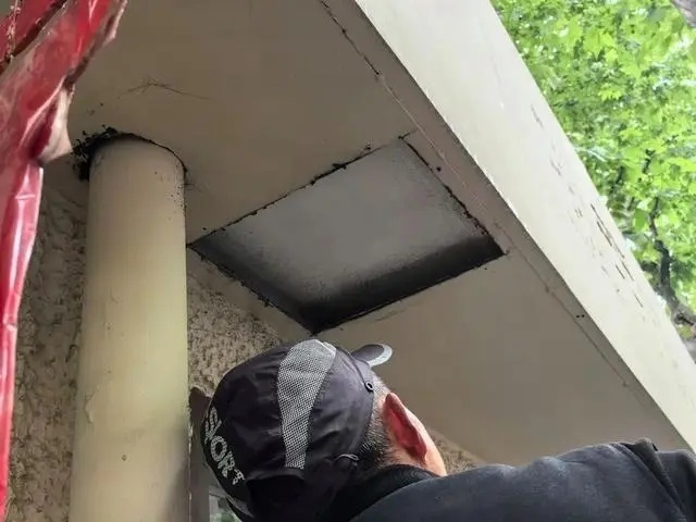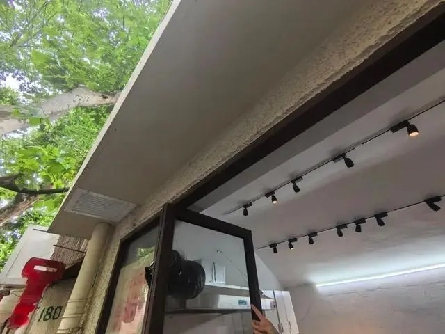 拆除门头上预留的检修孔后,记者看到里面露出的是房屋原本的挑空水泥屋檐,并不是常见的中空钢结构。