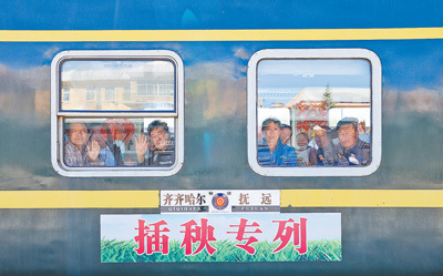 插秧客们乘坐K5161次列车去建三江平原插秧。哈铁供图