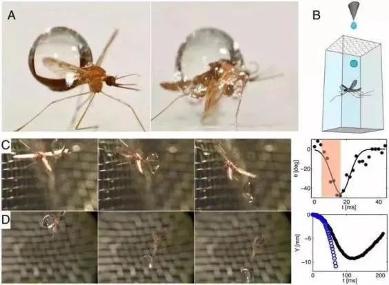 而如果正中身体,蚊子则不会“抵抗”,而是迅速随着水滴一起下落——但这并不是“随波逐流”,由于蚊子体表有大量的疏水细毛,它并不会和水滴融为一体,而是在下落过程中也能自由调整姿态,很快就能和雨滴侧向分离,恢复正常飞行。