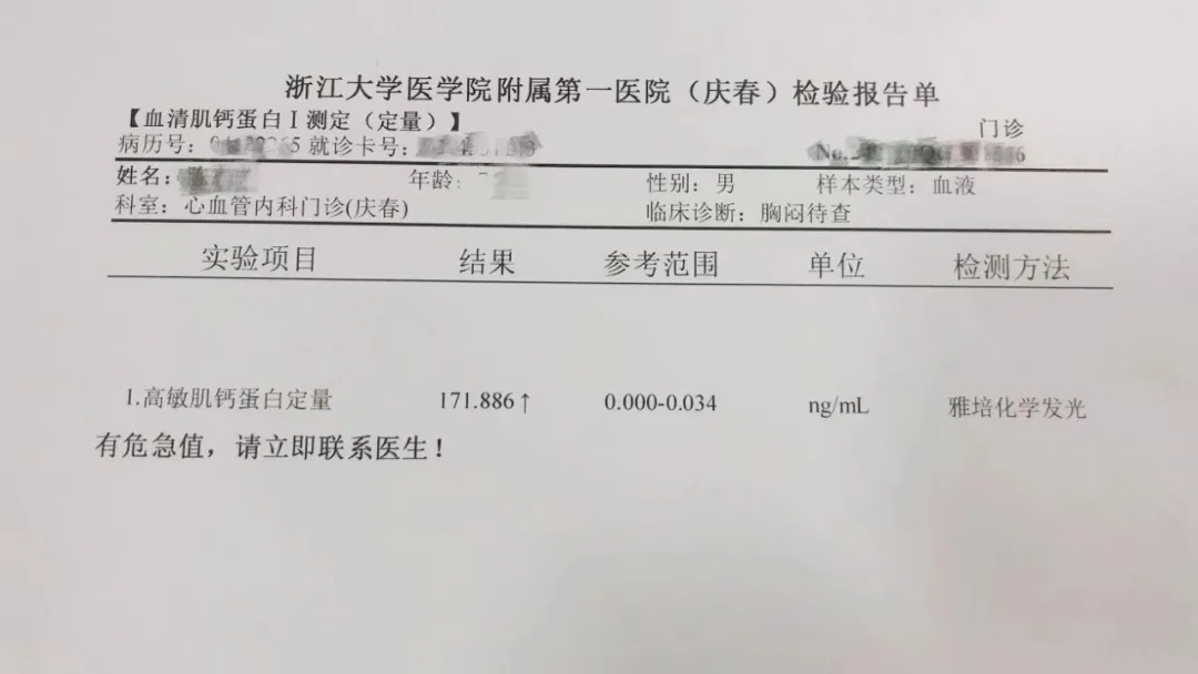 当天下午5:38,陈伯的检查报告全部出来,出现了“危急值”。他的“高敏肌钙蛋白”值超出正常范围很多倍,这个数值意味着陈伯的心肌细胞正在大量损伤坏死,他随时可能发生急性心肌梗死甚至有可能猝死。手机端同步收到陈伯心脏“危急值”报告的章黎苹副主任医师第一时间给陈伯打电话。